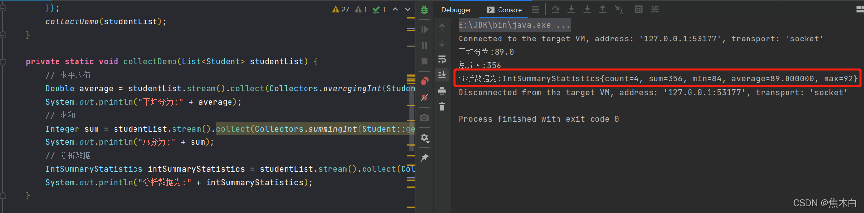 System.out.println("分析数据为:" + intSummaryStatistics);