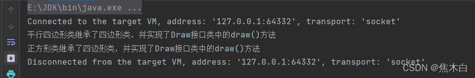 System.out.println("正方形类继承了四边形类,并实现了Draw接口类中的draw()方法");