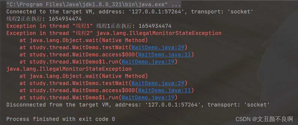 由此可知,调用 sleep() 方法时,并不是强依赖于 synchronized() 方法,如果我只有一个线程,那么使用 synchronized() 方法和不使用 synchronized() 方法的效果是一样的。如果有两个线程的话,也可以选择使用或者不使用 synchronized() 方法。但是 wait() 方法就不一样了,wait() 方法强依赖于 synchronized() 方法,如果不使用 synchronized() 方法的话,wait() 方法的程序就会报错。