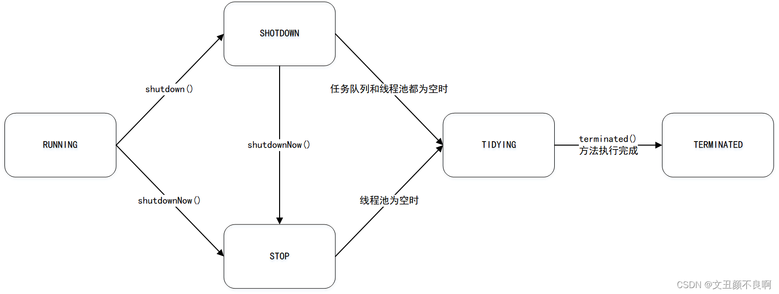 | TERMINATED | 表示线程池已停止运行,所有的工作线程已经被销毁,所有的任务已经被清空或者执行完毕,terminated() 方法执行完毕之后线程池进入此状态 |