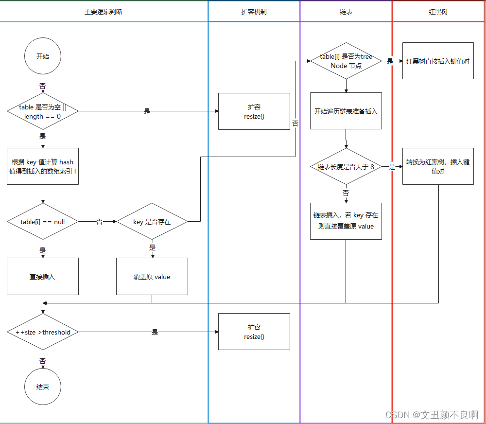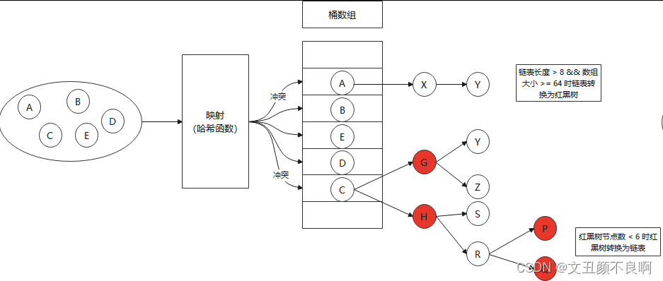 数据元素首先会通过映射关系,也就是散列函数,映射到桶数组对应索引的位置;如果发生冲突,从冲突的位置拉一个链表,插入冲突的元素;如果链表长度 > 8 && 数组大小 >= 64,链表转为红黑树;如果红黑树节点个数 < 6 ,则转为链表