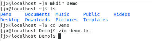 先创建了一个Demo的目录,然后使用vim demo.text 创建了一个文件,并进入了编辑模式,即进入了vim编辑器中,按i进入编辑模式,开始写文件,写完之后按esc退出编辑模式,然后按:wq保存并退出。