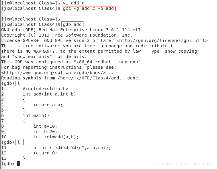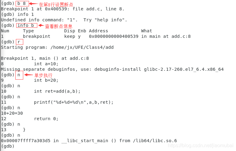 启动gdb:使用命令gdb 程序名即可启动gdb调试,首先需使用gcc –g 源文件 –o 目标文件将调试信息加到可执行文件中。