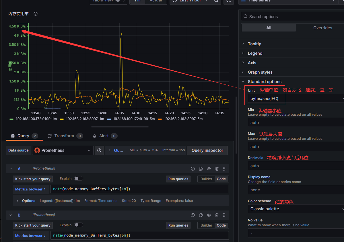 - Metrics 指标名称:例如 rate(node_memory_bytes[1m]) 即每分钟的增长率,可用 builder 或 code 配置