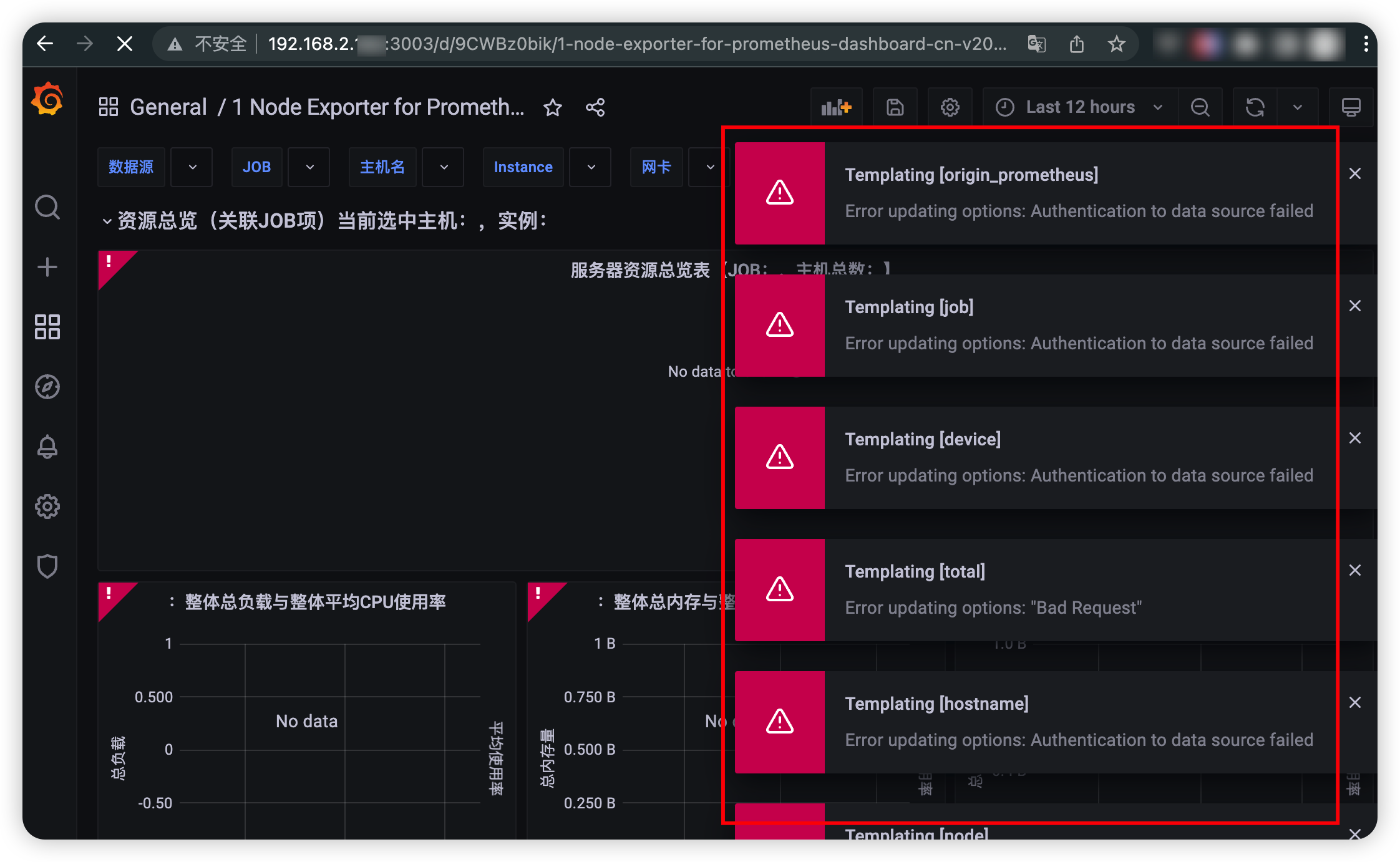 如果导入了 grafana 的 JSON 监控模板,但曲线图却无数据,一定是 PromQL 未成功,可以从两方面排查: