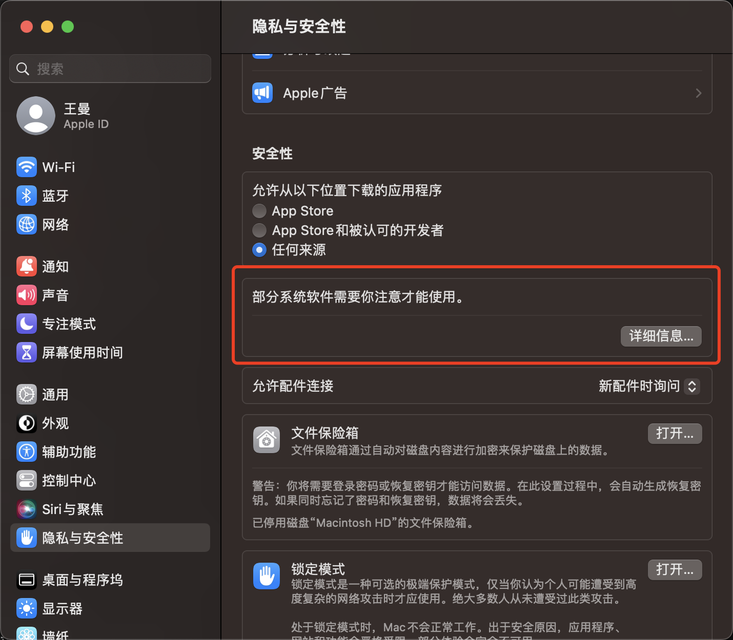 - 在弹出的窗口中勾选 “降低安全性” → 允许用户管理来自被认可开发者的内核扩展