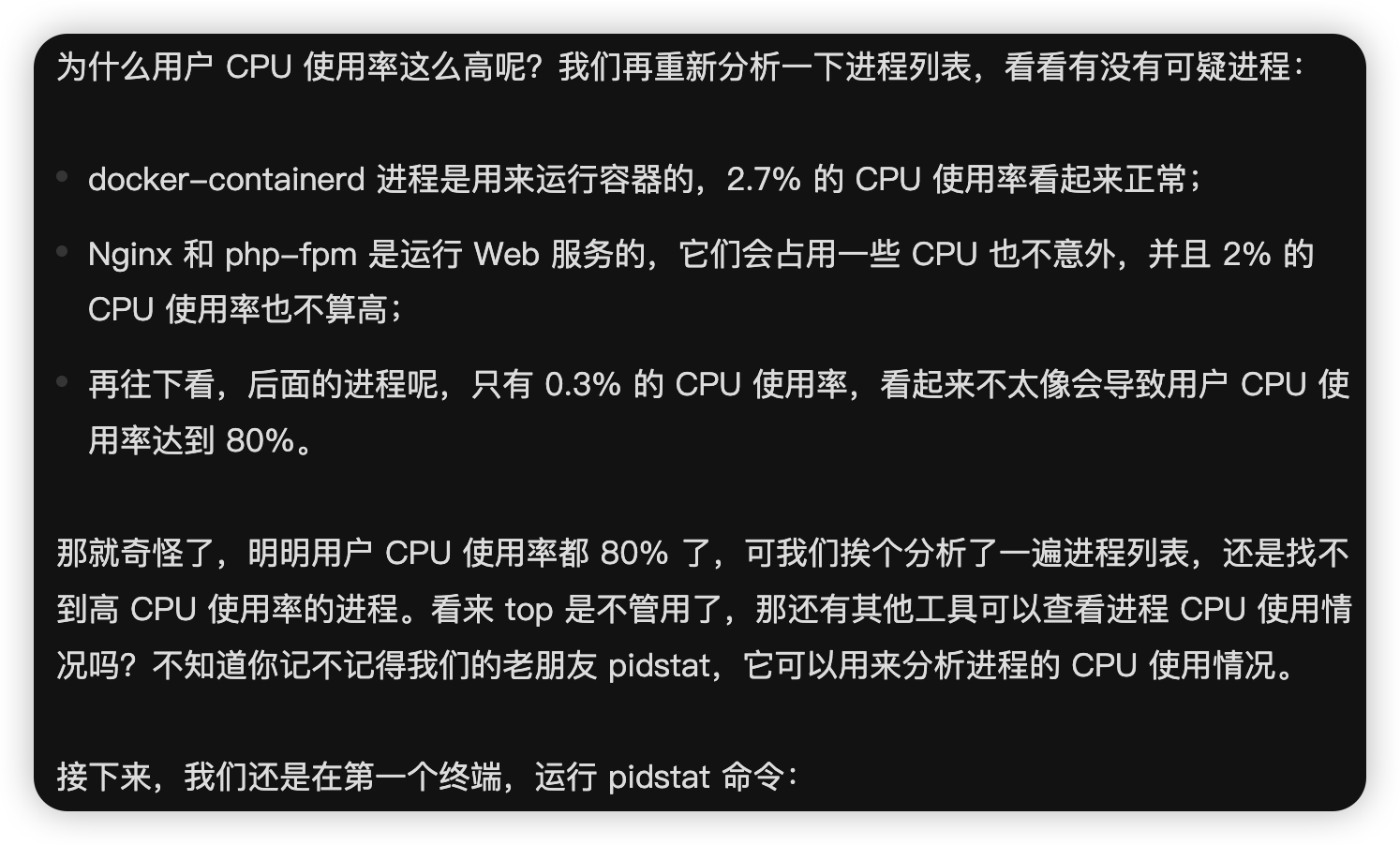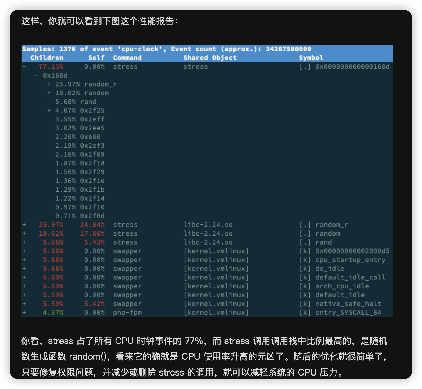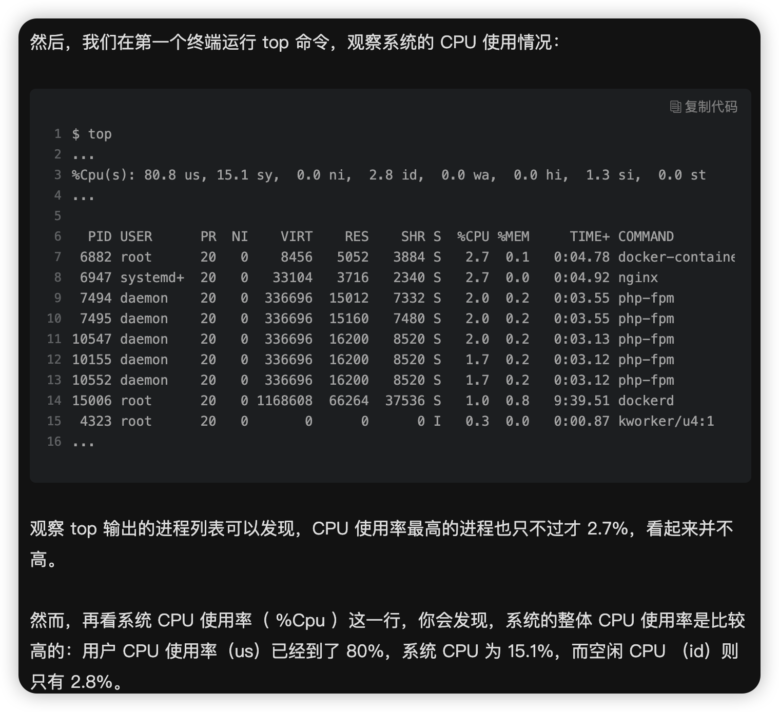 上一节我讲了 CPU 使用率是什么,并通过一个案例教你使用 top、vmstat、pidstat 等工具,排查高 CPU 使用率的进程,然后再使用 perf top 工具,定位应用内部函数的问题。不过就有人留言了,说似乎感觉高 CPU 使用率的问题,还是挺容易排查的。