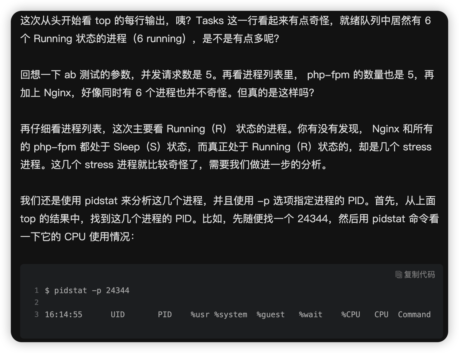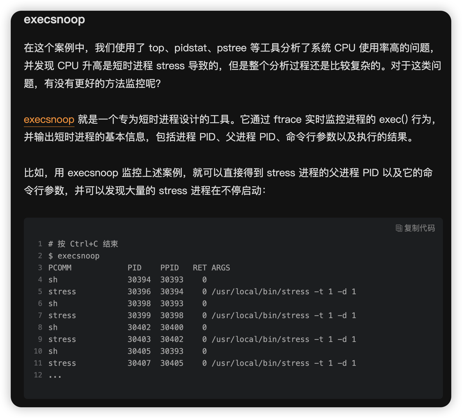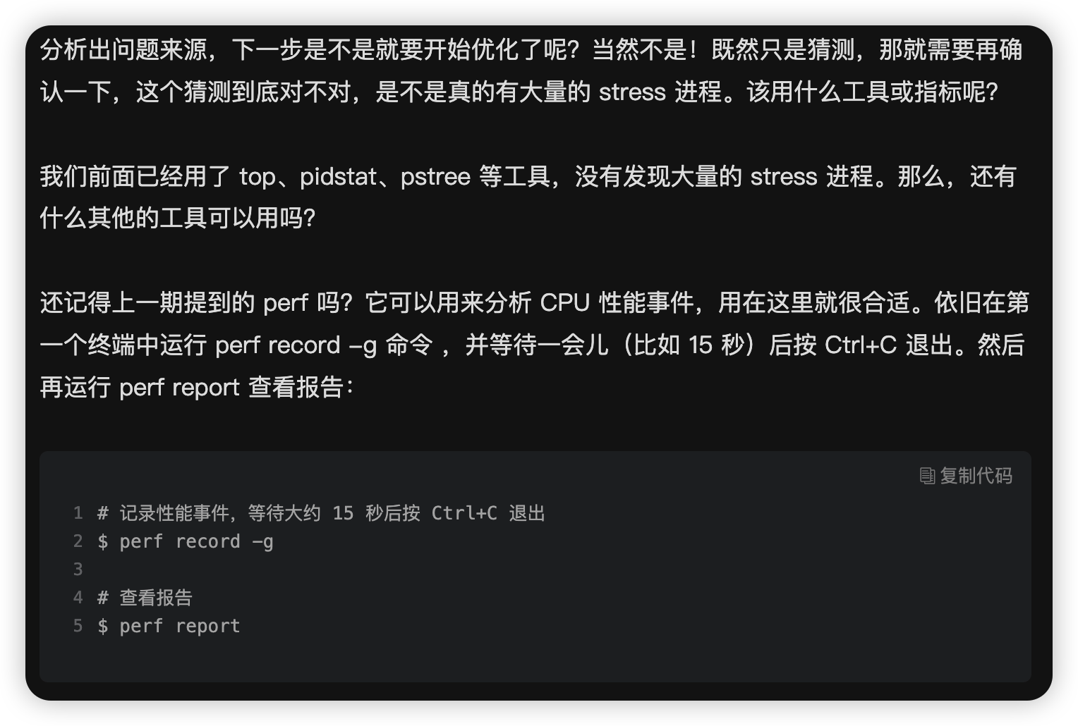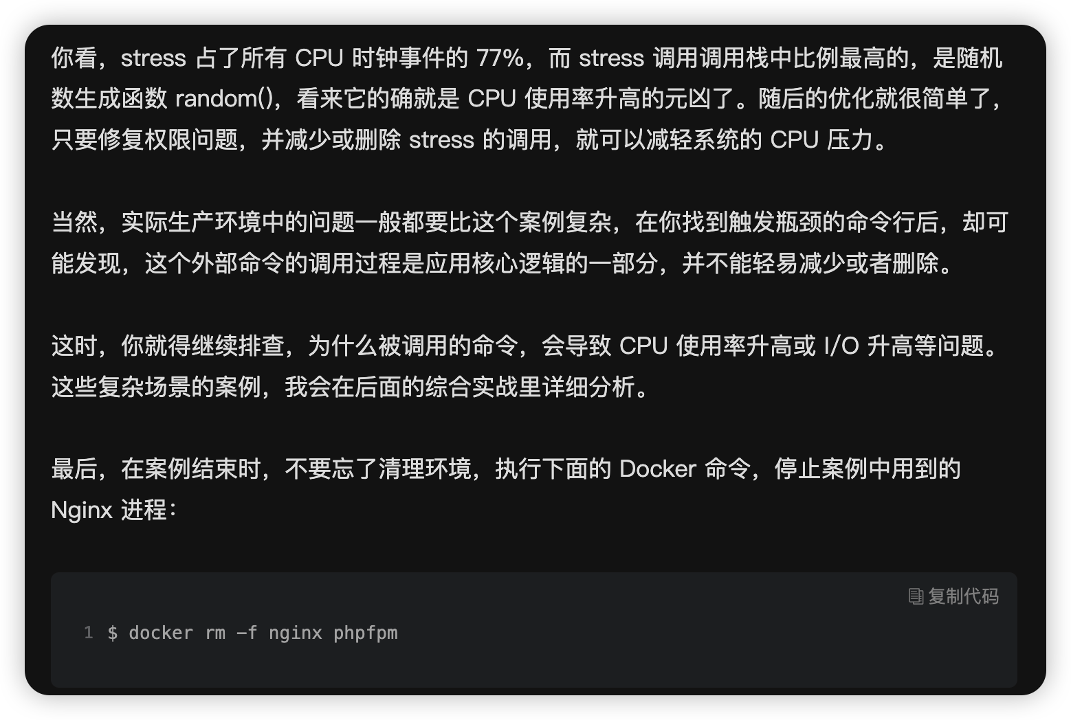 上一节我讲了 CPU 使用率是什么,并通过一个案例教你使用 top、vmstat、pidstat 等工具,排查高 CPU 使用率的进程,然后再使用 perf top 工具,定位应用内部函数的问题。不过就有人留言了,说似乎感觉高 CPU 使用率的问题,还是挺容易排查的。