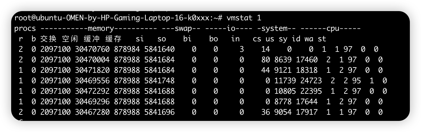# 接着, 在第二个终端运行 vmstat , 观察上下文切换情况: