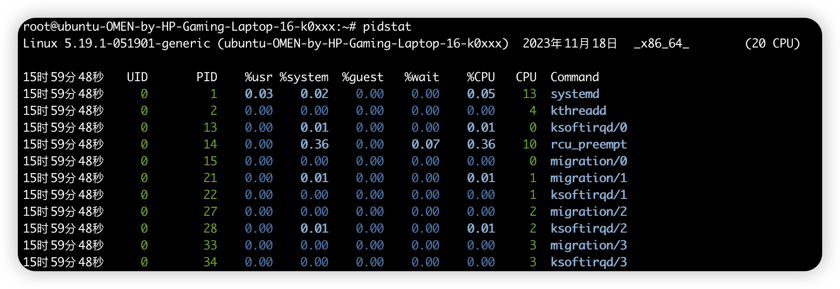- mpstat 是一个常用的多核 CPU 性能分析工具, 用来实时查看每个 CPU 的性能指标, 以及所有 CPU 的平均指标.