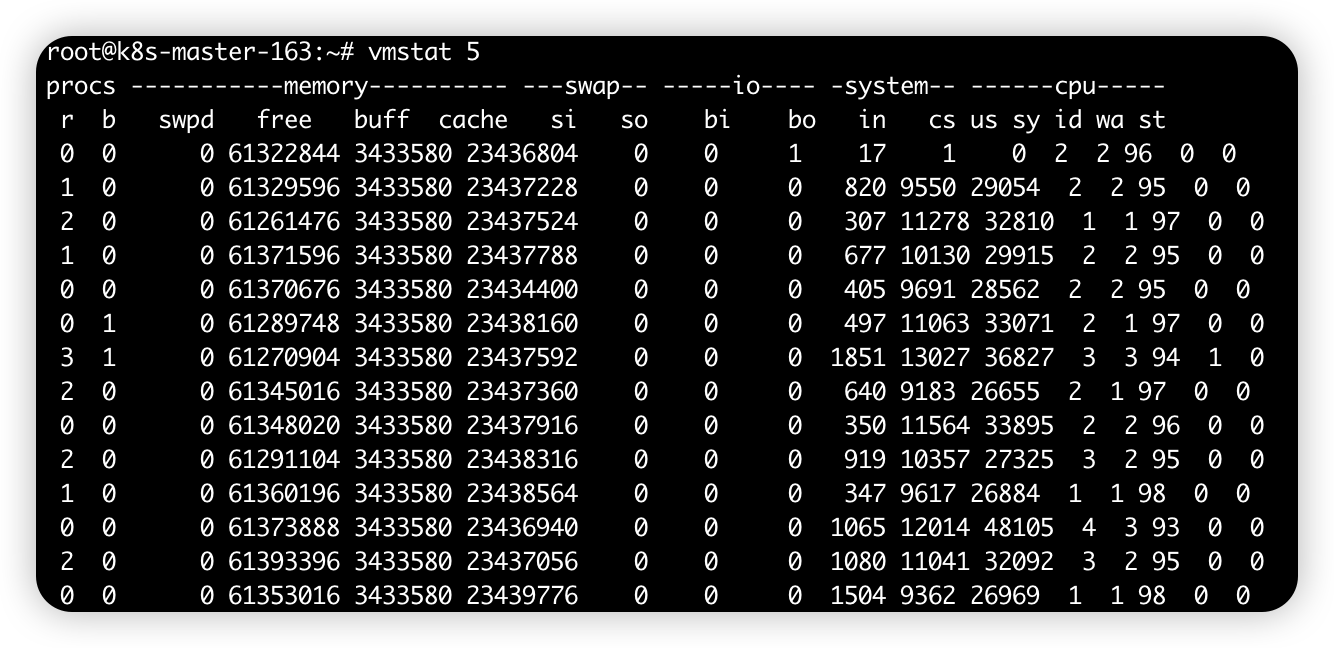 vmstat 1:分析内存使用情况、cpu上下文切换和中断的次数。(cs每秒上下文切换的次数,in每秒中断的次数,r运行或等待cpu的进程数,b中断睡眠状态的进程数。)来进一步判断到底是 io 过多导致问题、还是进程争抢激烈导致问题