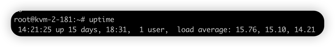 uptime # 输出23:01:47 up 69 days, 15:32, 2 users, load average: 1.73, 3.09, 3.40