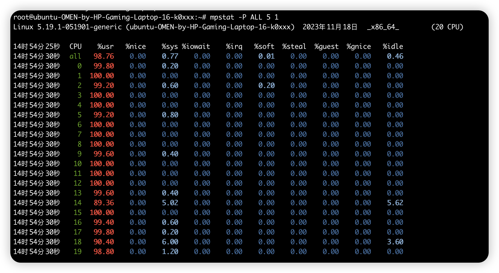 $ mpstat -P ALL 5 1 # 显示所有 CPU 的指标, 并在间隔 5 秒输出一组数据