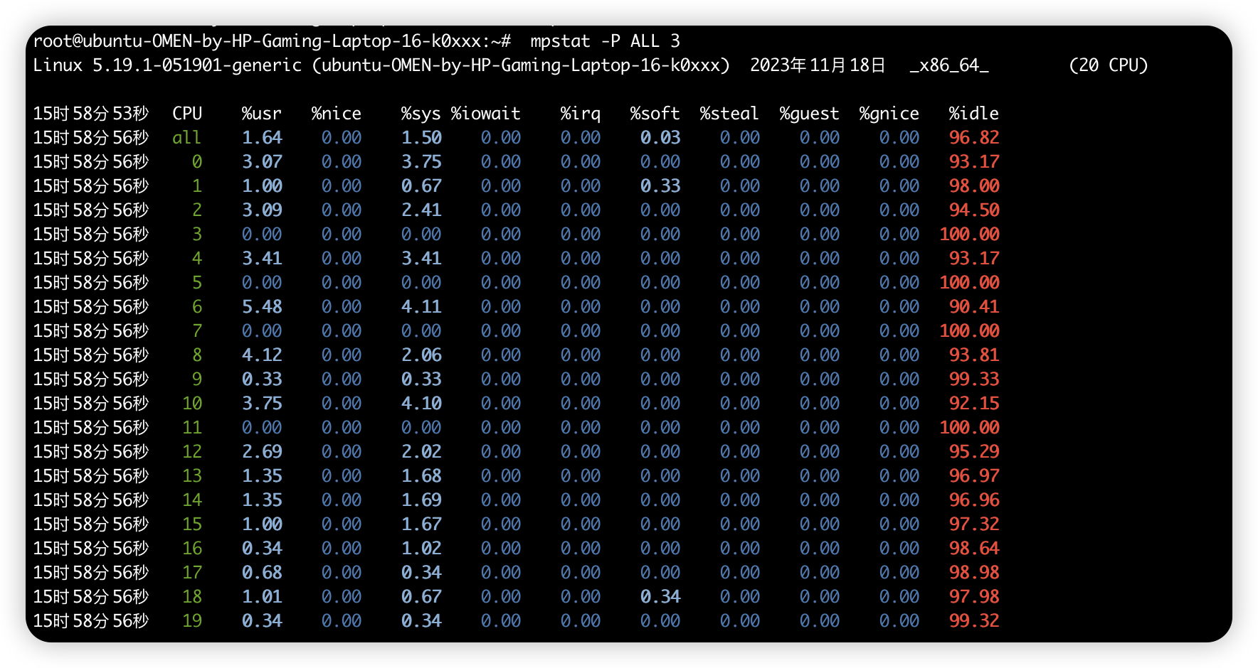 然后 mpstat -P ALL 3 看每个cpu当前的整体状况,可以重点看用户态、内核态、以及io等待三个参数