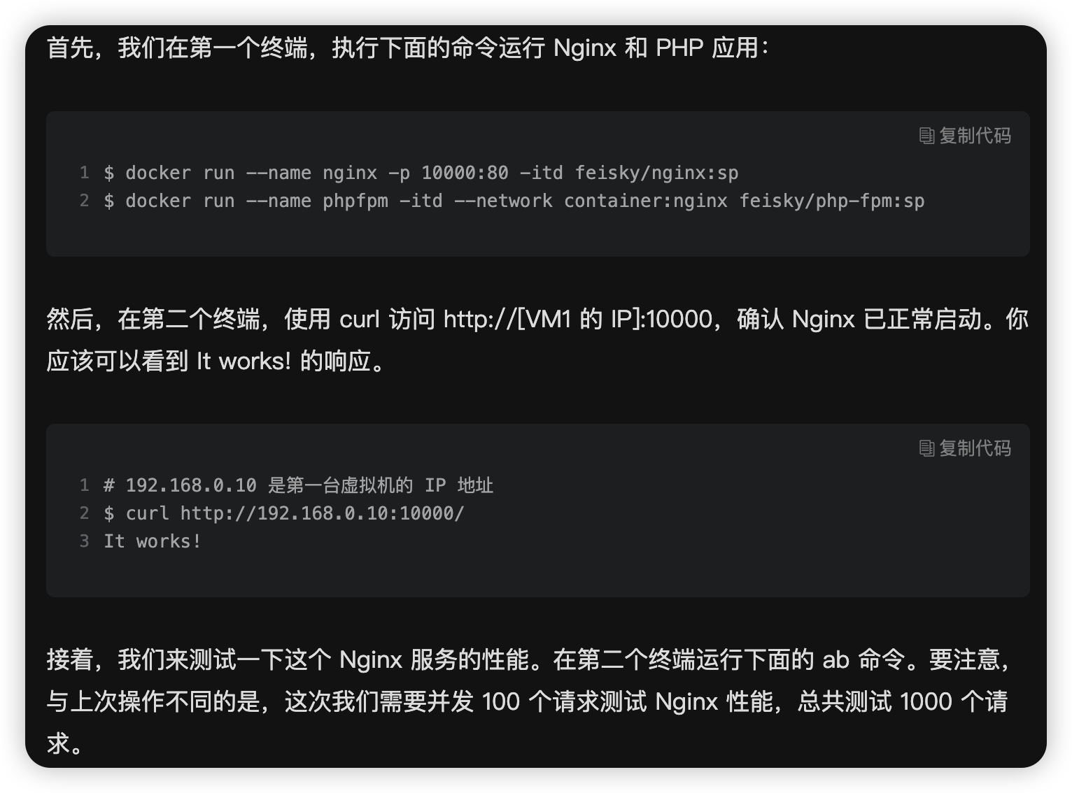 预先安装 docker、sysstat、perf、ab 等工具,如 apt install docker.io sysstat linux-tools-common apache2-utils