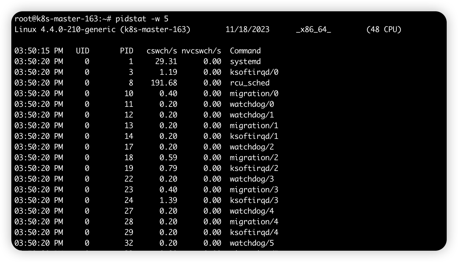 vmstat 只给出了系统总体的上下文切换情况, 要想查看每个进程的详细情况, 就需 pidstat -w 可以查看每个进程上下文切换情况.