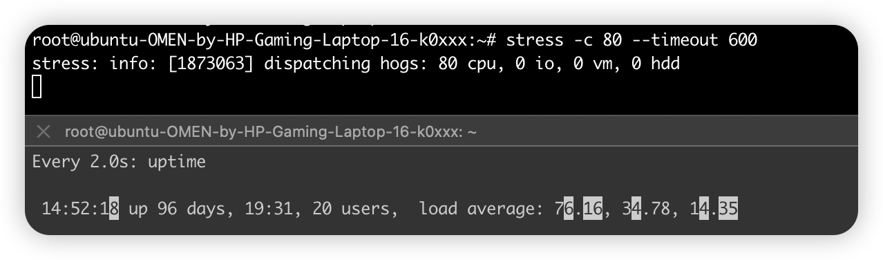 # 在第二个终端运行 uptime 查看平均负载的变化情况: