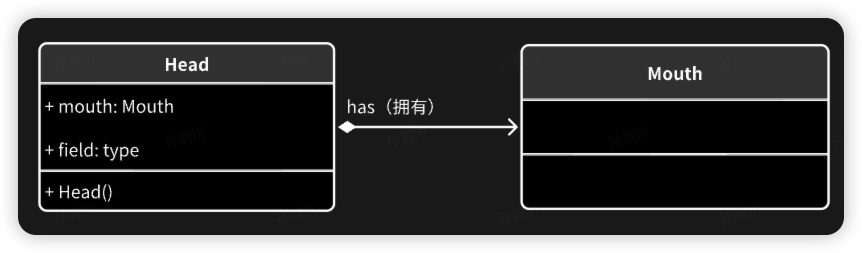 用带空心菱形和箭头的直线表示,菱形在整体类一侧。