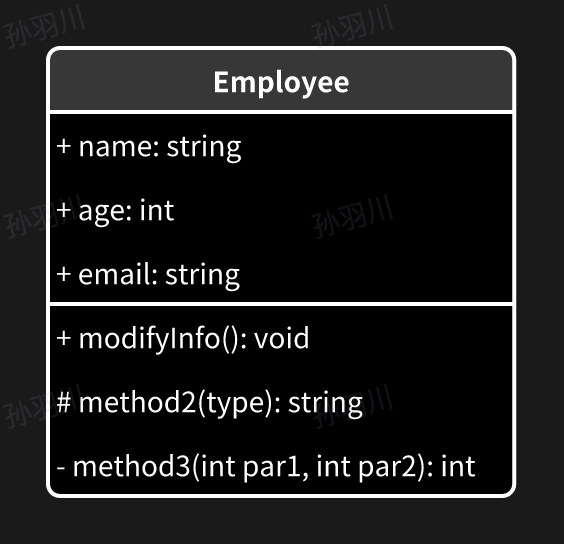 可见性有三种符号:+ 表示 public,# 是 protected,- 是 private。