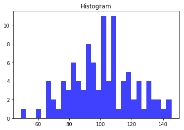 具体情况是: 找到x中的最小值和最大值, 然后在这个值域中均分bins份, 每一份都是一个小的值域, x中的元素就会对应的落在相应的值域中, Y轴的值就是在这个值域的数量(normed=False时)
