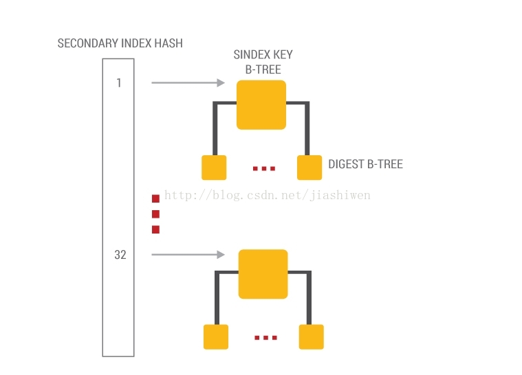 就像主索引一样,次索引是一个在B-tree中的B-tree形式的哈希表。每个逻辑次索引拥有32个物理树。当key被定义为索引操作,哈希函数用来决定索引条目创建在哪些物理树上。标识B-tree更新以后,注意一个次索引的键可以引用多个主记录。结构的最底层是基于记录数量的完整B-tree。