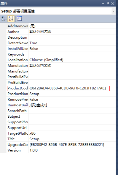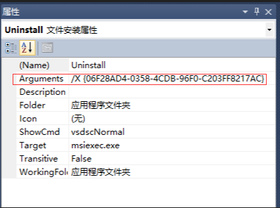 命名了快捷方式之后,将Setup属性(点击解决方案里面的setup弹出属性)ProductCode拷贝到Uninstall属性的Arguments里面: