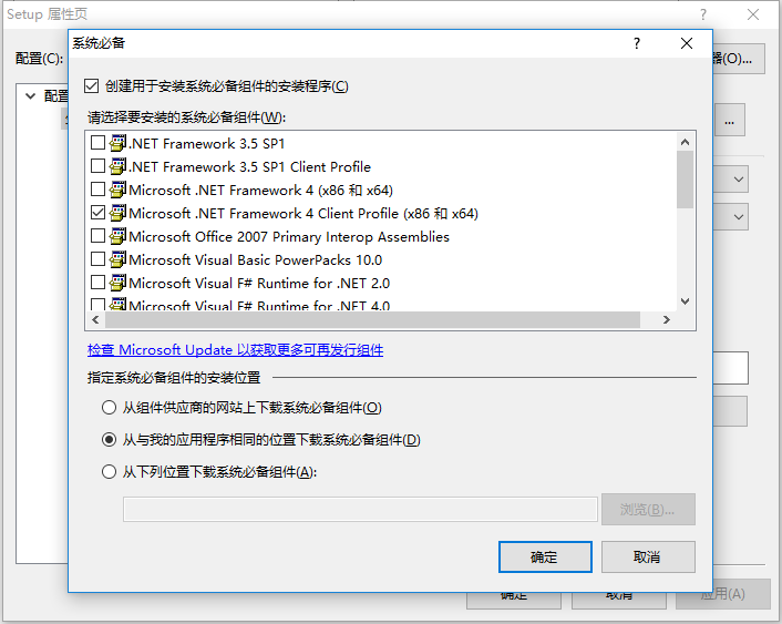 单选按钮中,选择“从与我的应用程序相同的位置下载系统必备组件”-》确定