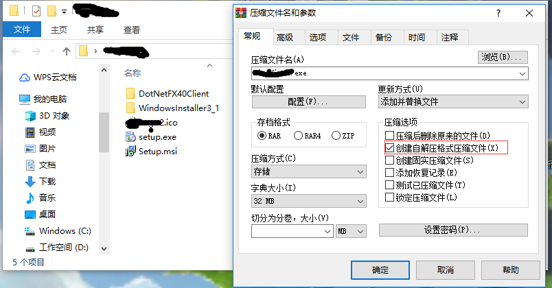 1>将要打在一起的文件及文件夹全部选中,右键 →“添加到压缩文件”,在打开的压缩面板的“常规”选项卡中勾选“创建自解压格式压缩文件”,此时会发现默认的压缩文件名编程了 .exe 后缀名了;压缩方式最好选择“存储”,这样打包后的程序会很快解压缩并运行。如图: