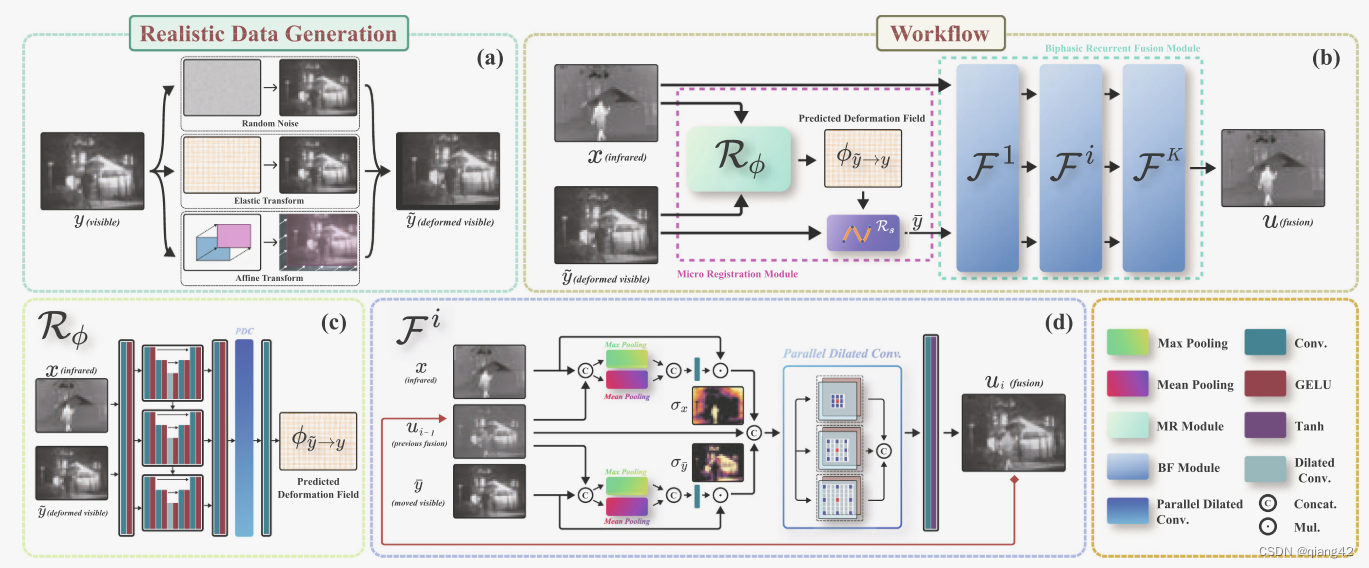 图像融合论文阅读:ReCoNet: Recurrent Correction Network for Fast and Efficient Multi-modality Image Fusion 大多数现有方法无法处理轻微【错位】图像(即未对齐、配准)且【计算消耗较高】,为了解决这两个问题,作者提出了ReCoNet,该模型分别使用【变形模块】来补偿未配准问题,使用【注意力机制】减轻重影伪影问题。同时,该网络包含了一个【循环运行的并行膨胀卷积层】,显著降低空间和计算复杂度。