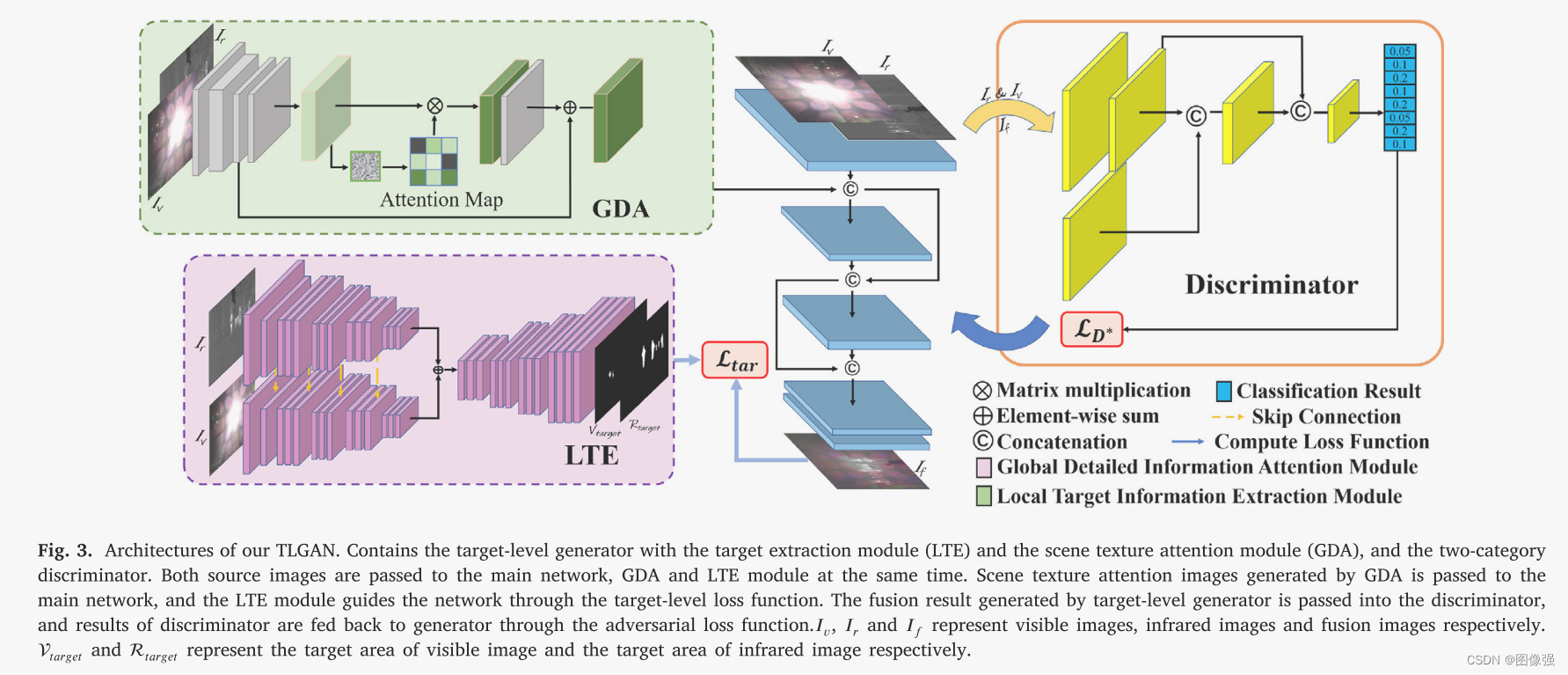 图像融合论文阅读:(TLGAN)Boosting target-level IVIF with regional information coordination 现有的方法【倾向于评估全局信息】,忽略了【特征提取过程中】对【特定目标信息】的保留,导致了一定程度的信息丢失。为了解决这个问题,作者提出了一种【目标级】的IVIF方法,通过【场景纹理关注模块】增强全局信息的互补描述,通过利用加入【目标级损失函数】的【目标提取模块】保留目标区域特征,并通过【目标-场景信息损失函数】的协调,实现了目标信息和场景信息的均衡。