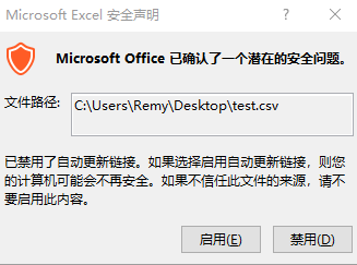 =TODAY() 没有被显示,而是显示计算出来的一串数值,说明注入的函数被执行。也可以注入去执行一些命令,例如:当输入的内容是:=calc|a!z,打开CSV文件,就会显示如下对话框,