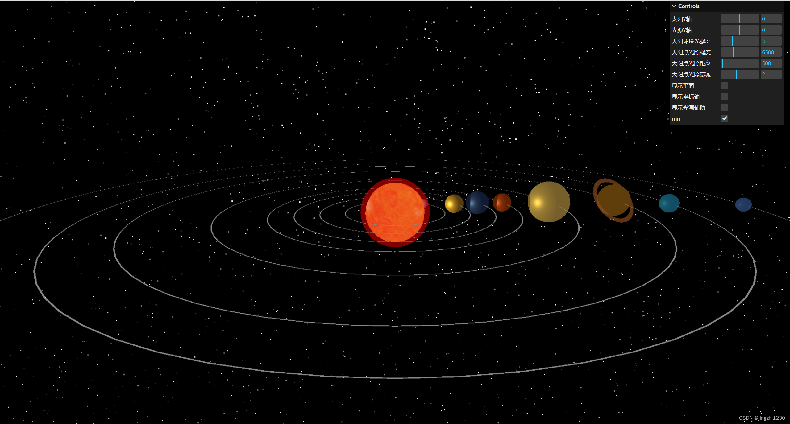文章详细展示了如何在Three.js中创建逼真的行星模型,配合光源和阴影效果,还包含用户界面控制和实时渲染动画的代码片段。