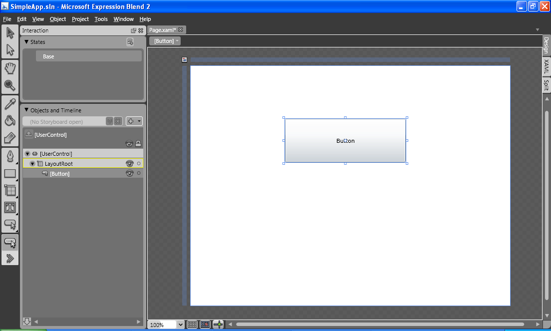 After you created a new project, Expression Blend will present you with an empty XAML document (named page.xaml by default).