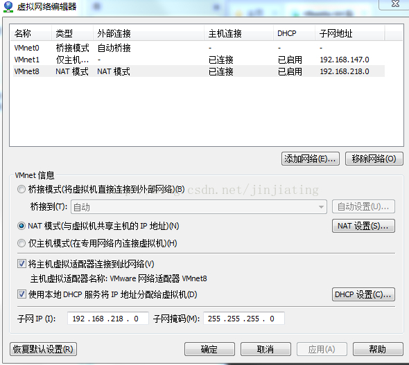 然后虚拟机-->设置-->硬件Tab-->网络适配器-->自定义(U) 选择VMnet8(NAT模式)