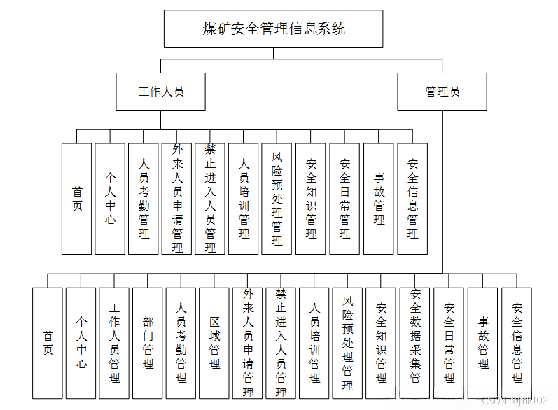 为了更好的去理清本系统整体思路,对该系统以结构图的形式表达出来,设计实现该煤矿安全管理信息系统的功能结构图如下所示: