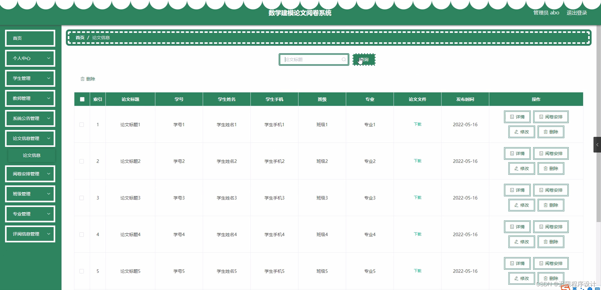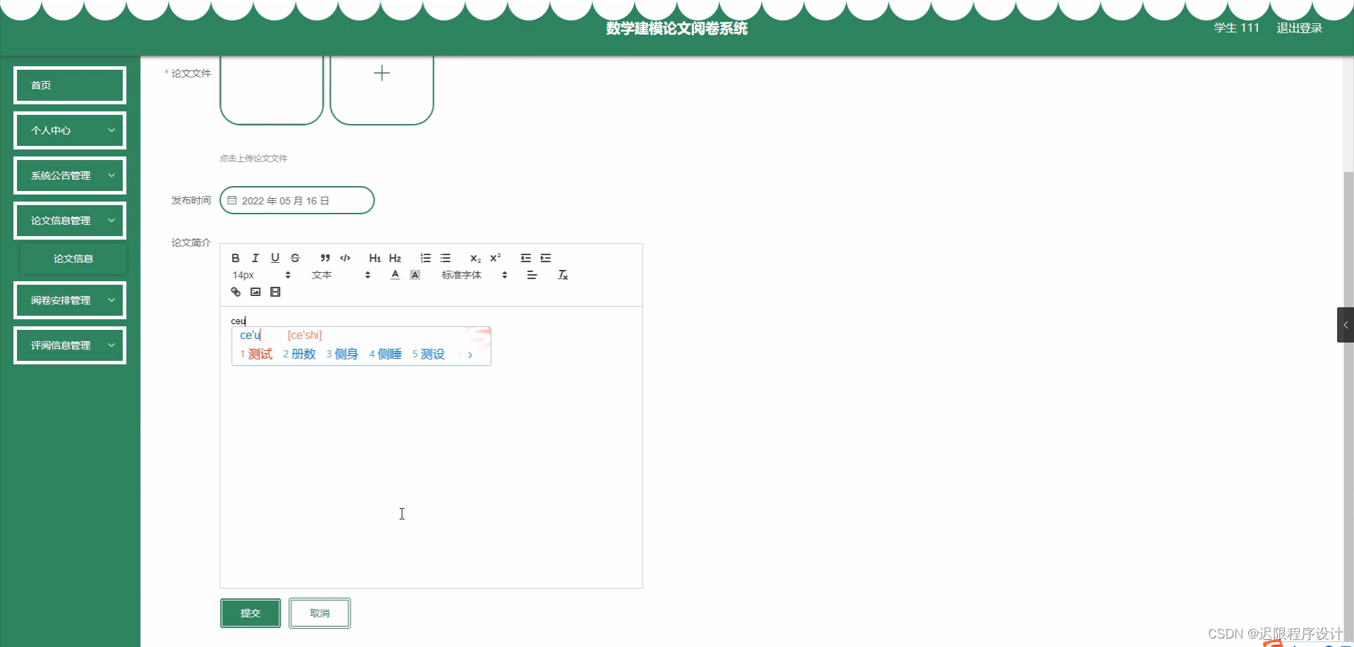 数学建模是应用数学领域的一个重要分支,它通过建立数学模型来解决工程、经济、管理等领域中的实际问题。在高等教育中,数学建模竞赛和课程受到广泛的关注,学生通过参与建模活动能够锻炼自己的逻辑思维能力和解决实际问题的能力。然而,随着参赛人数的增加,传统的人工阅卷方式耗时耗力,且难以保证评分的公正性和准确性。因此,开发一个自动化的数学建模论文阅卷系统显得尤为重要。该系统可以自动提取论文中的关键信息,对论文进行初步评分和分类,从而减轻评委的工作负担,提高阅卷效率。采用html、css、javascript和vue等前端技术结合java、springboot后端技术和mysql数据库,可以实现一个操作简便、智能评分、高效管理的在线阅卷平台。开发此类系统将使用eclipse或idea集成开发环境,并结合tomcat服务器、jdk1.8和maven3.3.9等工具来提高开发效率及系统稳定性。