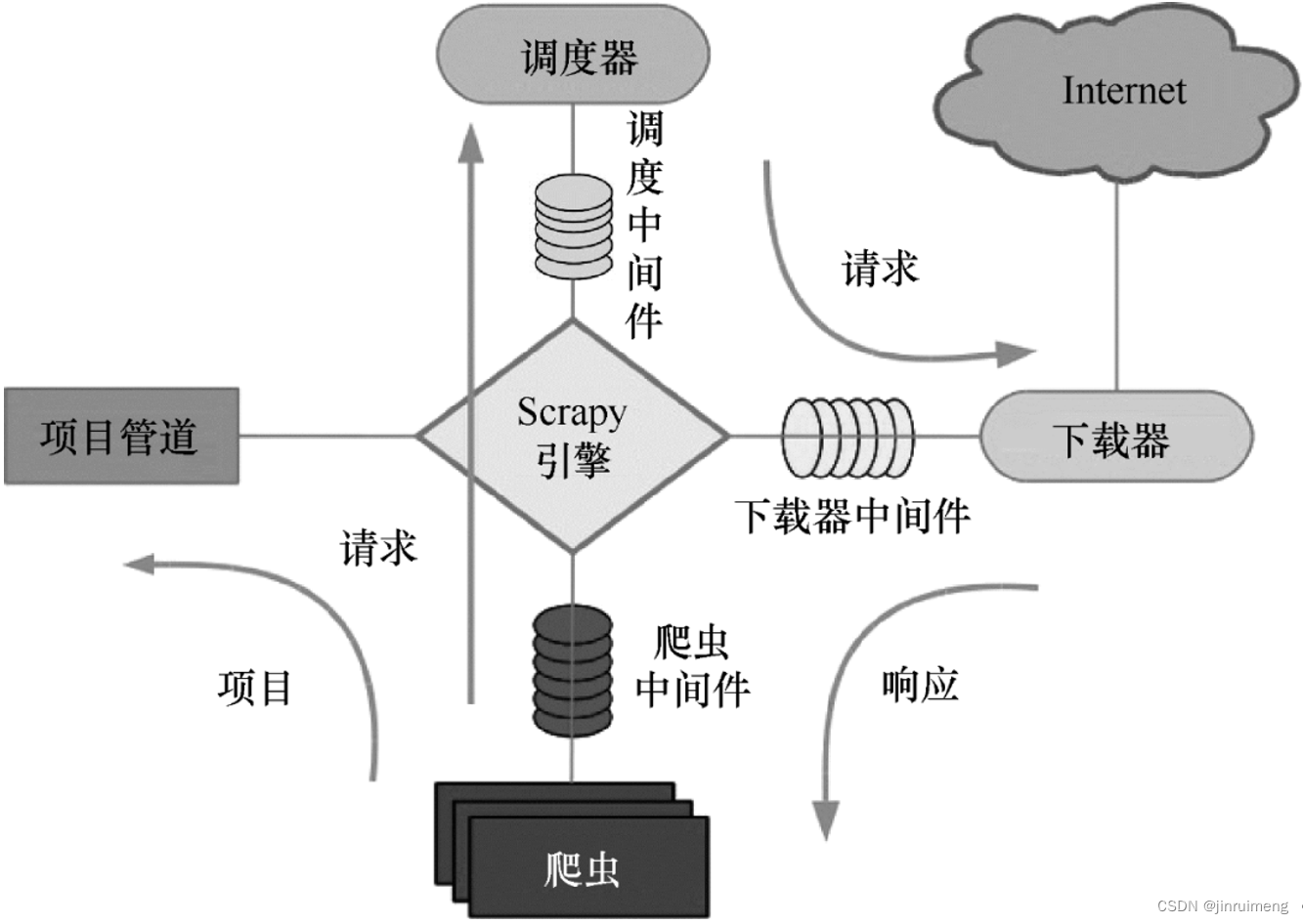 Scrapy的整个数据处理流程由Scrapy引擎进行控制。Scrapy运行流程如下: