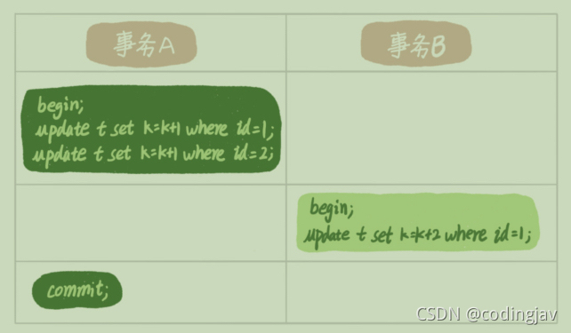 这是因为事务A持有两个记录的行锁,都是在commit的时候才释放的。也就是说,在InnoDB事务中,行锁是在需要的时候才加上的,但并不是不需要就立刻释放,而是要等到事务结束时才释放。这个就是两阶段锁协议。那对我们有什么帮助呢??如果你的事务中需要锁多个行,要把最可能造成锁冲突、最可能影响并发度的锁尽量往后放。