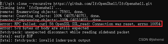 fatal: unable to access ‘https://github.com/IfcOpenShell/IfcOpenshell.git/‘: Failed to connect to gi 3.重新 git clone。