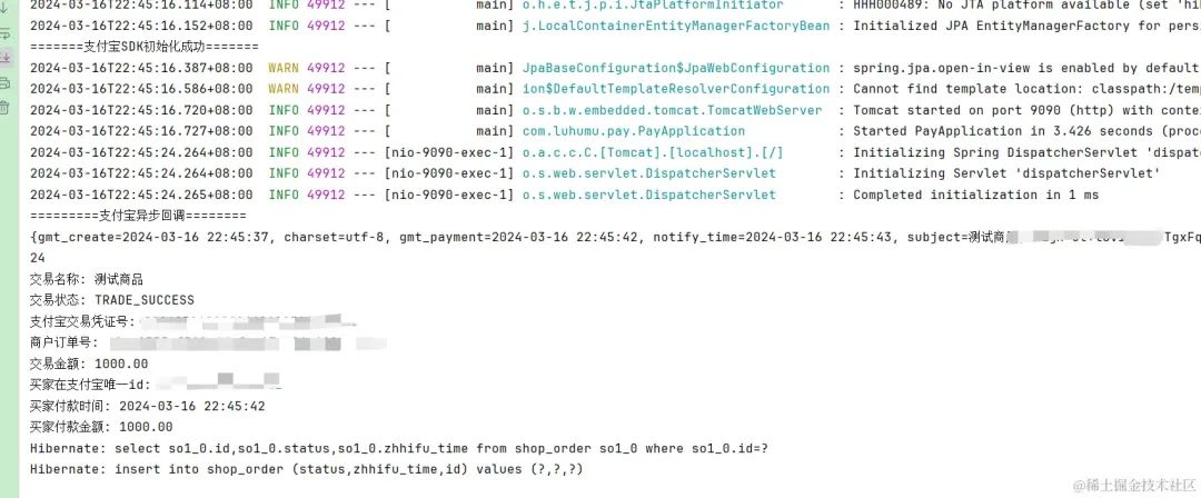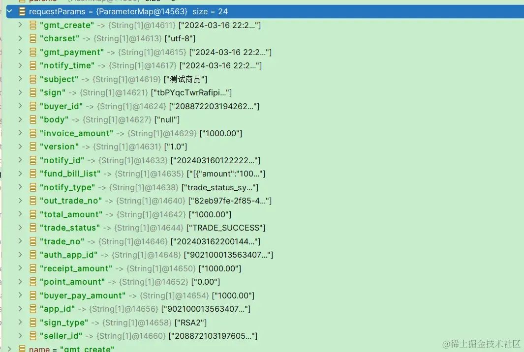 // 返回的所有元素 其中有gmt_create=2024-03-16 22:26:17, charset=utf-8, gmt_payment=2024-03-16 22:26:21, notify_time=2024-03-16 22:26:23, subject=测试商品