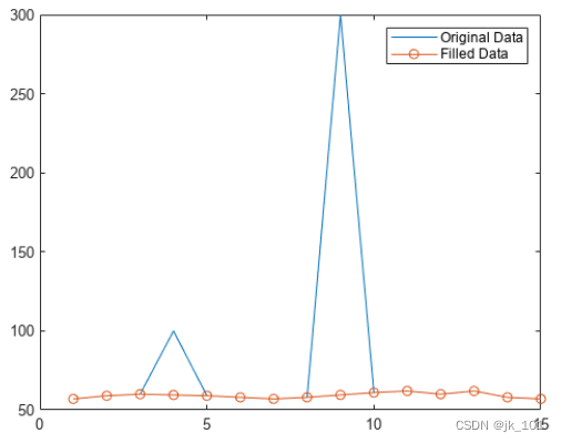 使用 "linear" 方法填充数据向量中的离群值,并可视化填充的数据。创建一个包含两个离群值的数据向量。