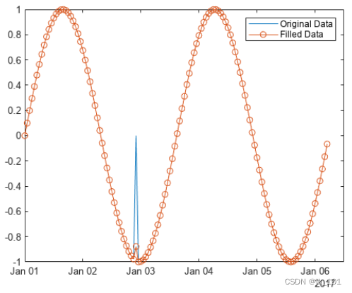 filloutliers(A,fillmethod,2) 根据 A 的每行中的数据填充离群值,并返回一个 m×n 矩阵。