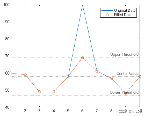 B = filloutliers(A,fillmethod,"percentiles",threshold) 将离群值定义为 threshold 所指定的百分位数以外的点。threshold 参数是包含上下百分位数阈值的二元素行向量,例如 [10 90]。