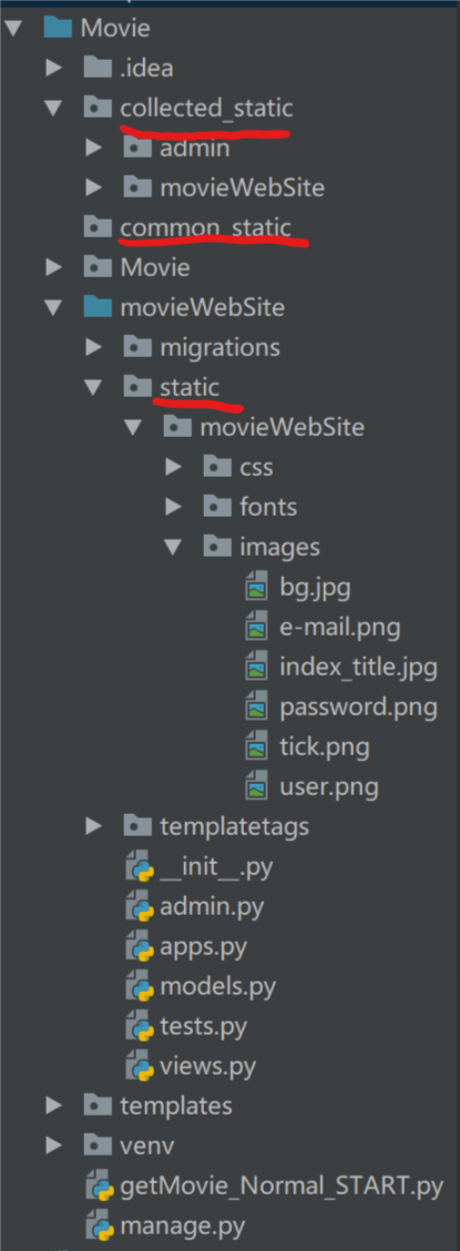 我把common_static(公共静态文件夹)、collected_static(搜集的静态文件夹)放在项目目录下,把static(app的静态文件夹)放在app目录下
