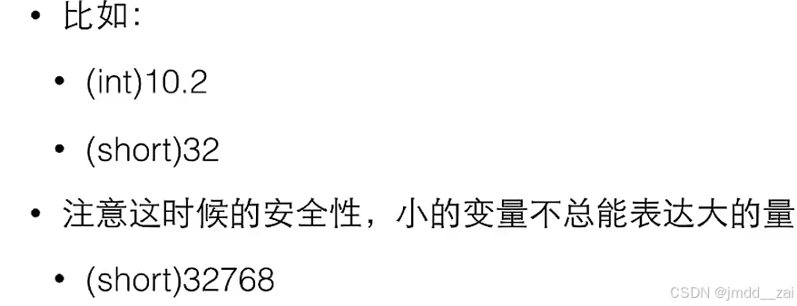 【强制类型转换】 ·要把一个量强制转换成另一个类型(通常是较小的类型),需要: (类型)值 。 (只是从那个变量计算出了一个新的类型的值,它并不改变那个变量,无论是值还是类型都不改变)