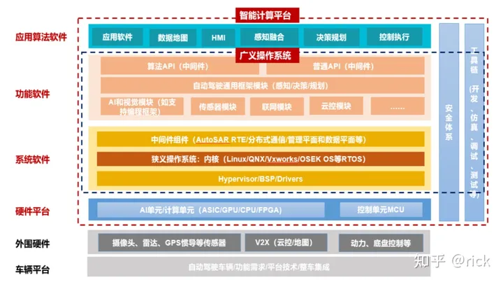 车载智能计算平台自下而上可大致划分为硬件平台、系统软件(硬件抽象层+OS内核+中间件)、功能软件(库组件+中间件)和应用算法软件等四个部分。狭义上的OS特指可直接搭载在硬件上的OS内核;而广义OS从下至上包括从BSP、操作系统内核、中间件及库组件等硬件和上层应用之间的所有程序。