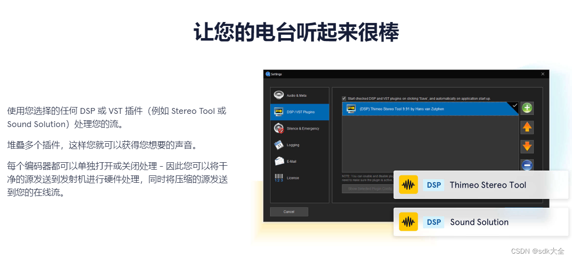 使用您选择的任何 DSP 或 VST 插件(例如 Stereo Tool 或 Sound Solution)处理您的流。
