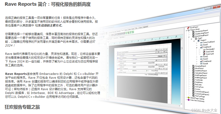Nevrona Rave Reports是一款适用于 Delphi 和 C++Builder 的高级报告解决方案,提供了一套专为强大而灵活的数据库报告而设计的组件。Rave 可视化报表设计器以其基于组件的系统和基于页面的总体布局而脱颖而出,为开发人员提供了直观的可视化界面。架构师版本允许最终用户完全访问设计功能,使他们能够独立修改或创建报告。