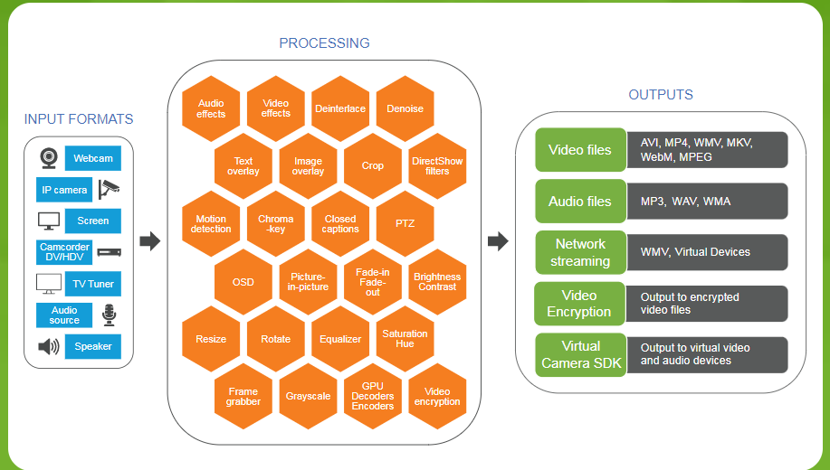 video formats - AVI, MPEG-1/2, WMV, 3GP, QuickTime MOV, MPEG-4/H264 (AVC), FLV, ASF, MP4, MJPEG, DV, MKV (Matroska), Real Video (full list)