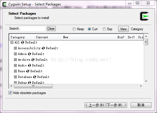 从Cygwin官网下载安装程序,下载完成后双击开始Cygwin进行安装。一直点击下一步,直到出现软件包管理界面,如下: